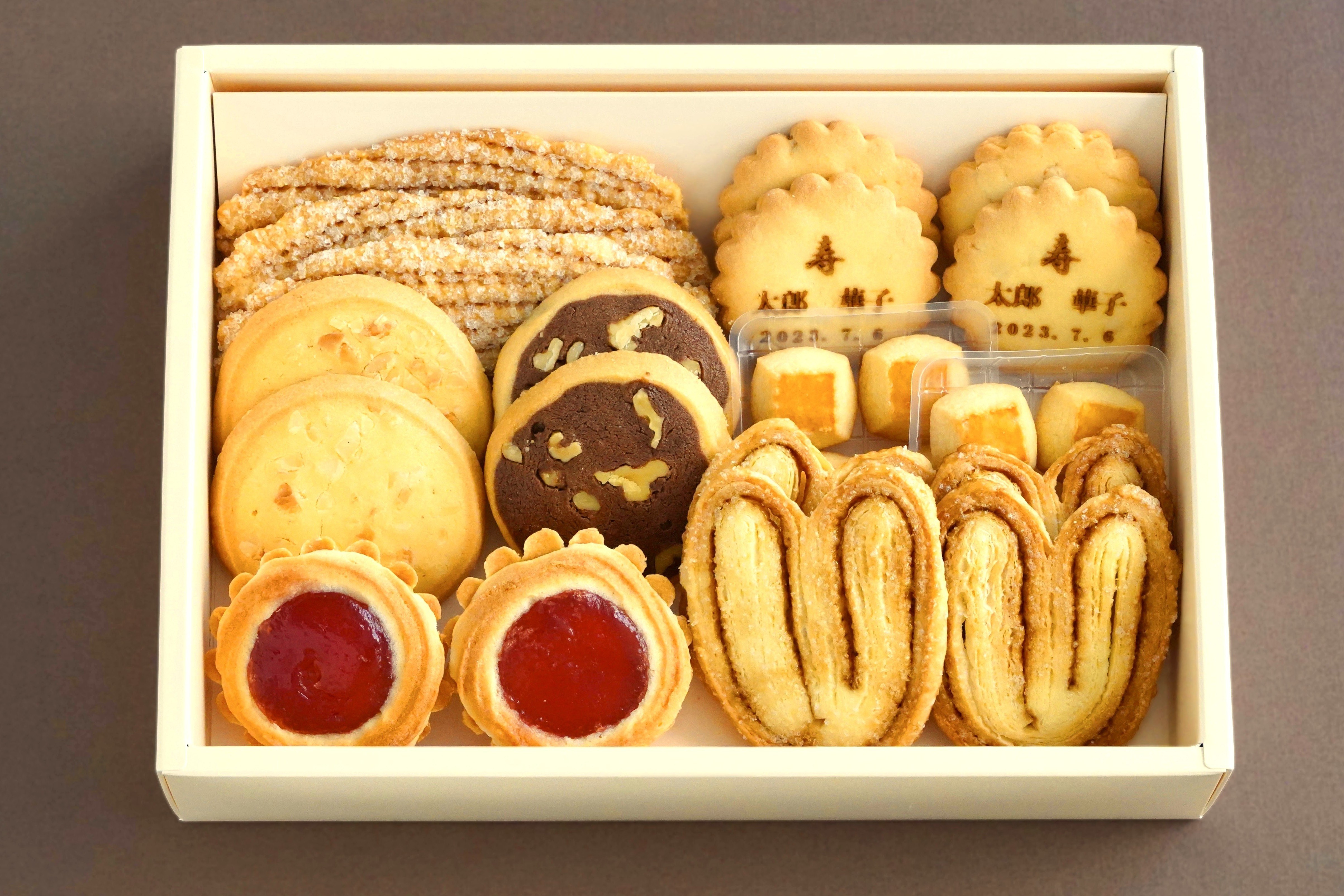 オリジナルデザインを印字したバタークッキーを人気のドライケーキシリーズの詰め合わせセットにお入れします。