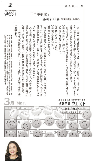 2009年4月から月刊『文藝春秋』にて洋菓子舗ウエストが提供する、著名人によるショートエッセイ「風の詩」がスタートいたしました。